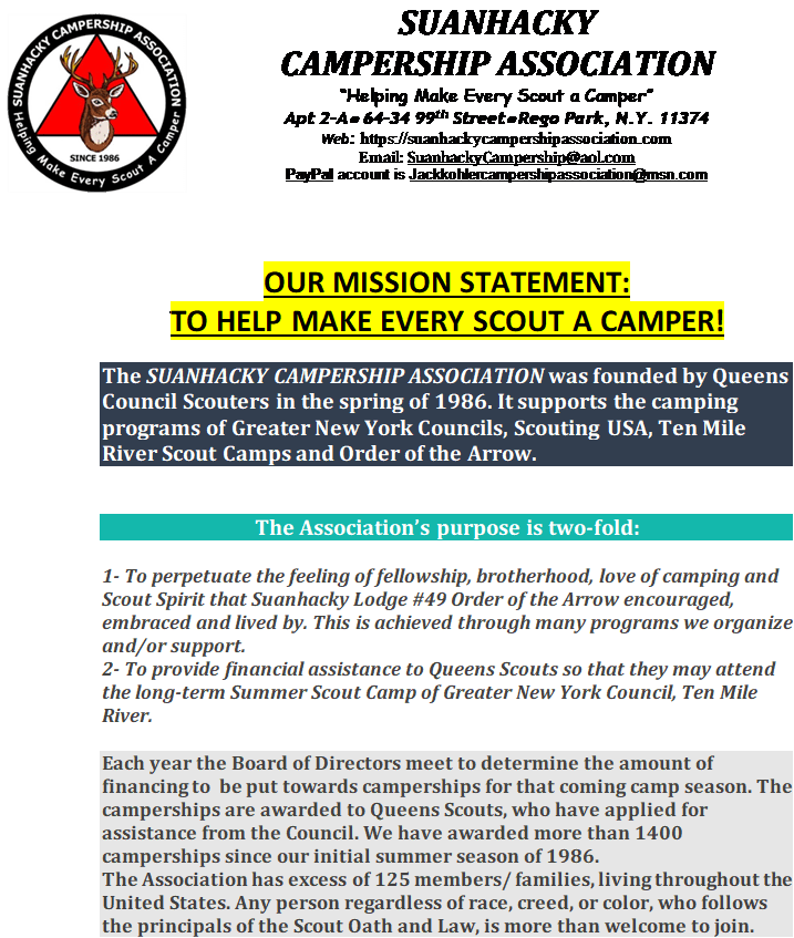 2- To provide financial assistance to Queens Scouts so that they may attend the long term Summer Scout Camp of Greater New York Council, Ten Mile River.
